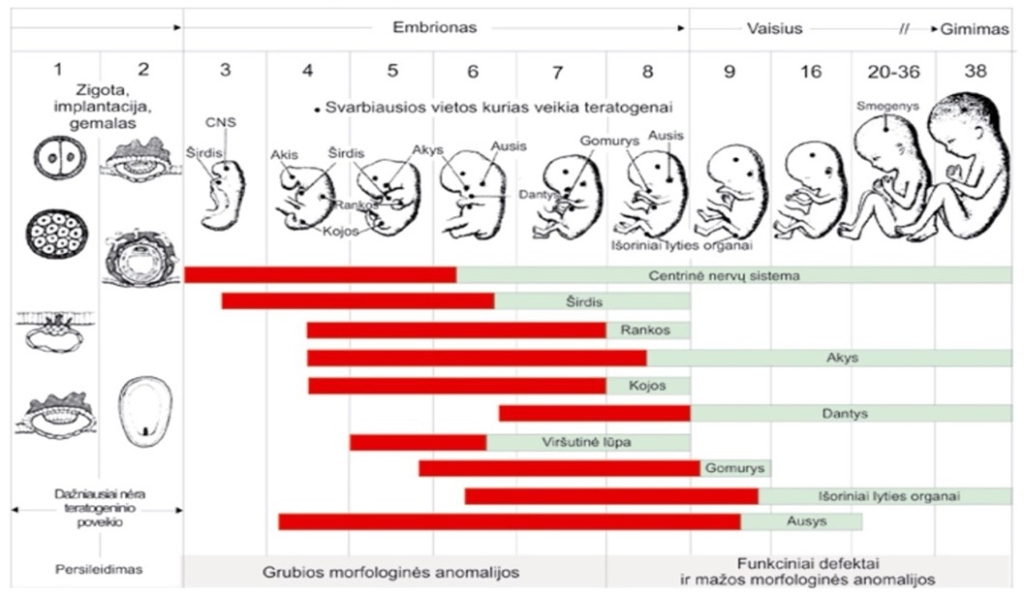 ŽMOGAUS EMBRIONO IR VAISIAUS KRITINIŲ RAIDOS PERIODŲ SCHEMA (raudona spalva – jautriausias organo vystymosi laikas)
